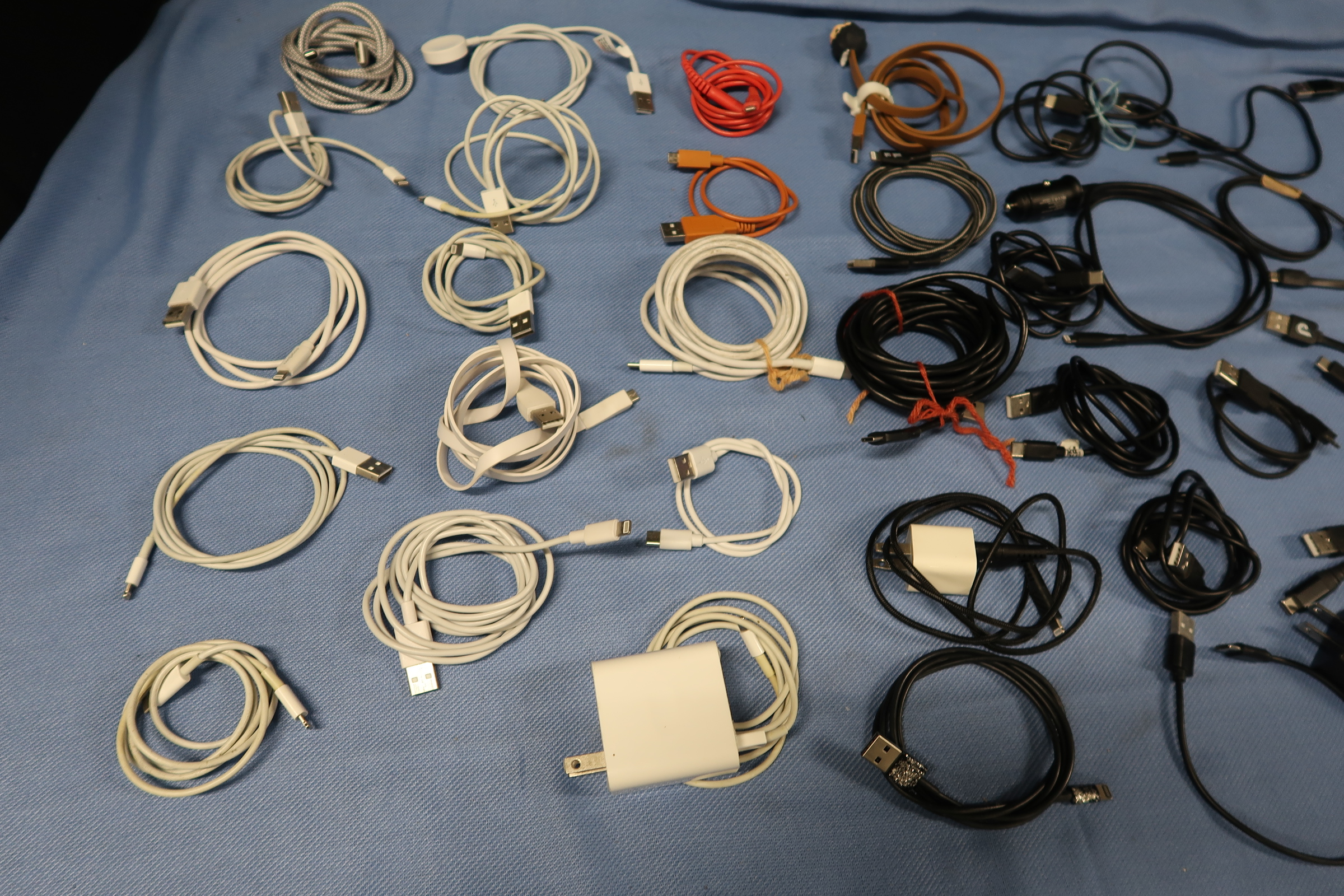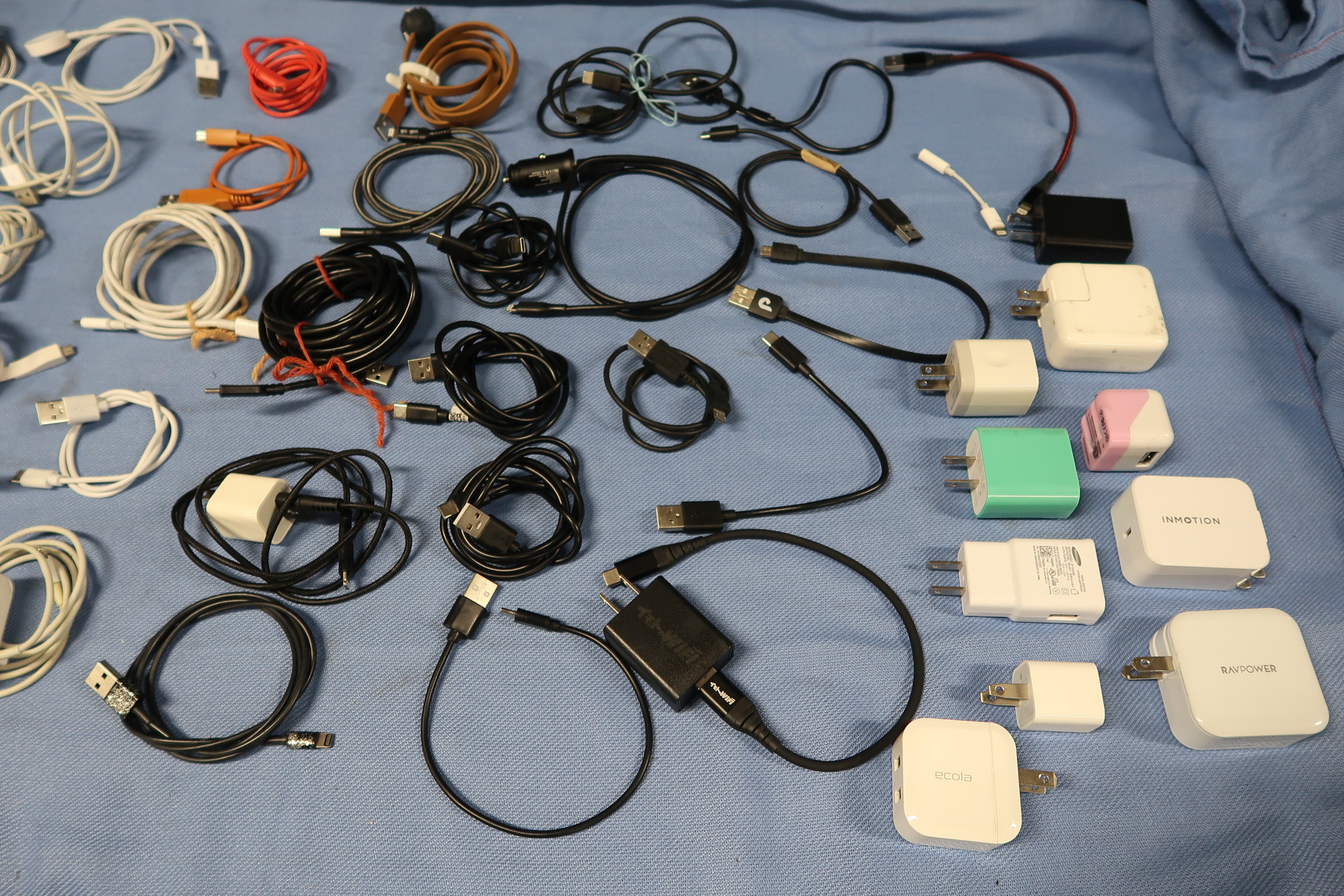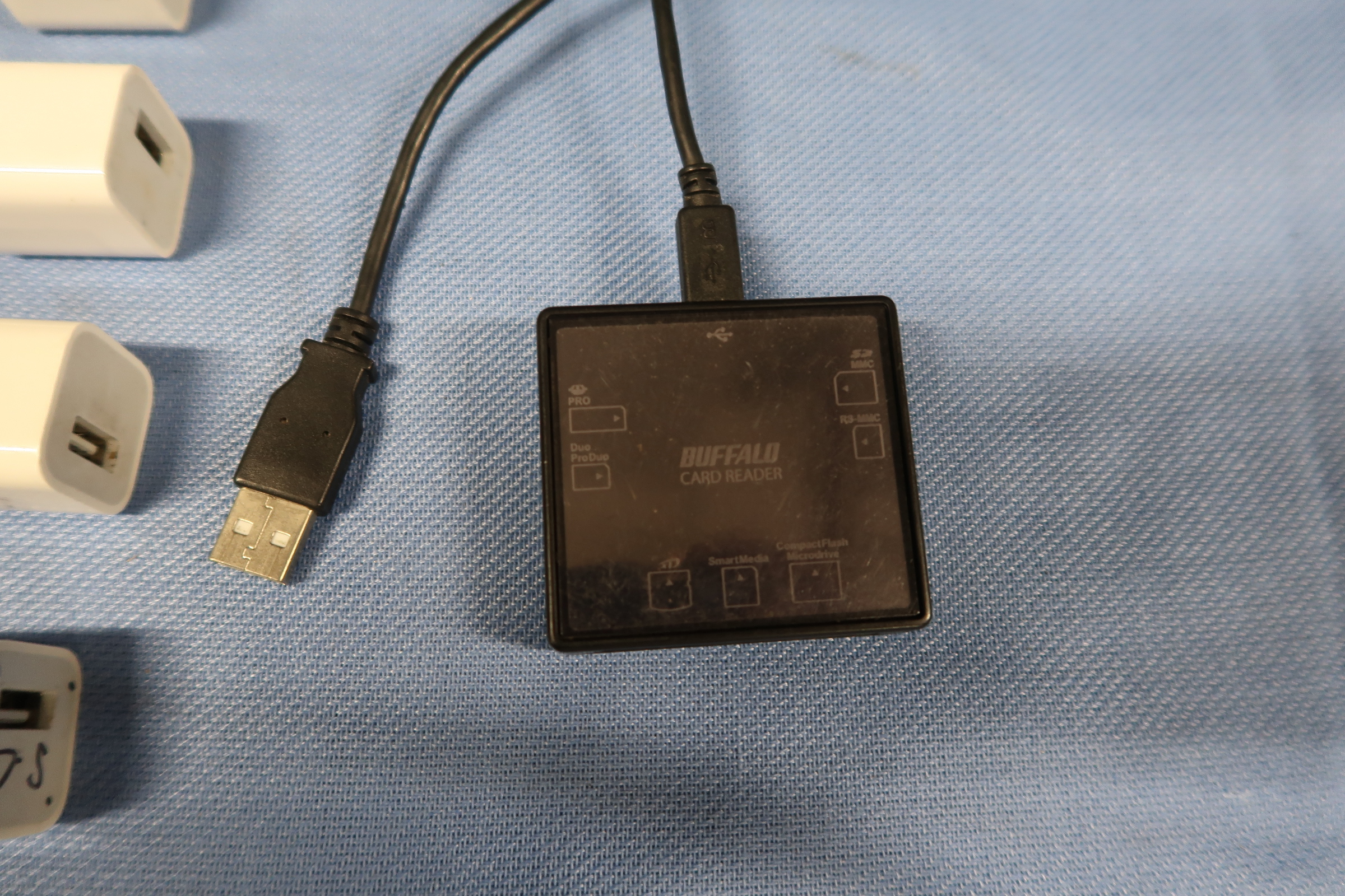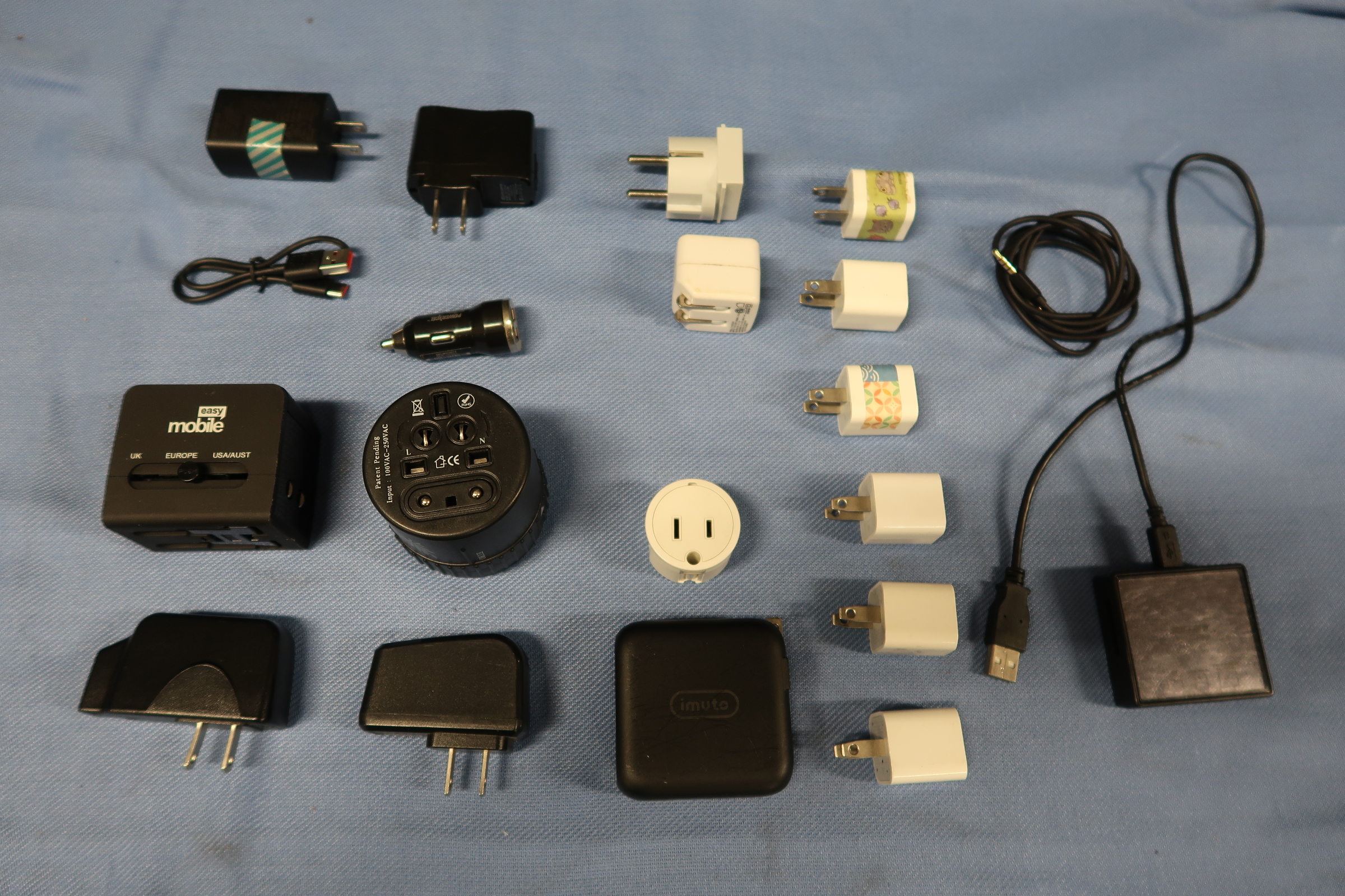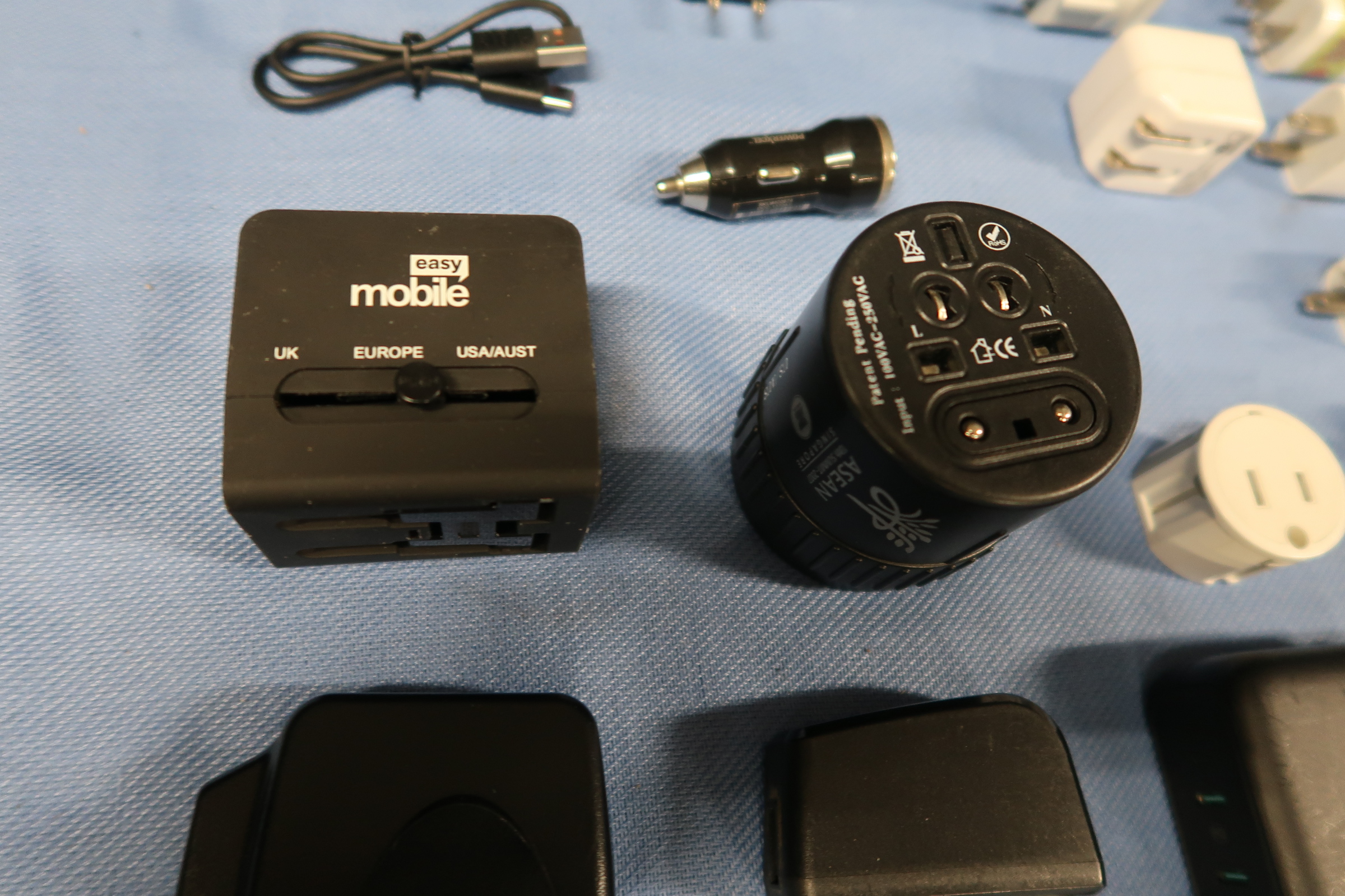 Assorted Chargers, Adapters, Travel Power Converters, and Buffalo Card Reader.