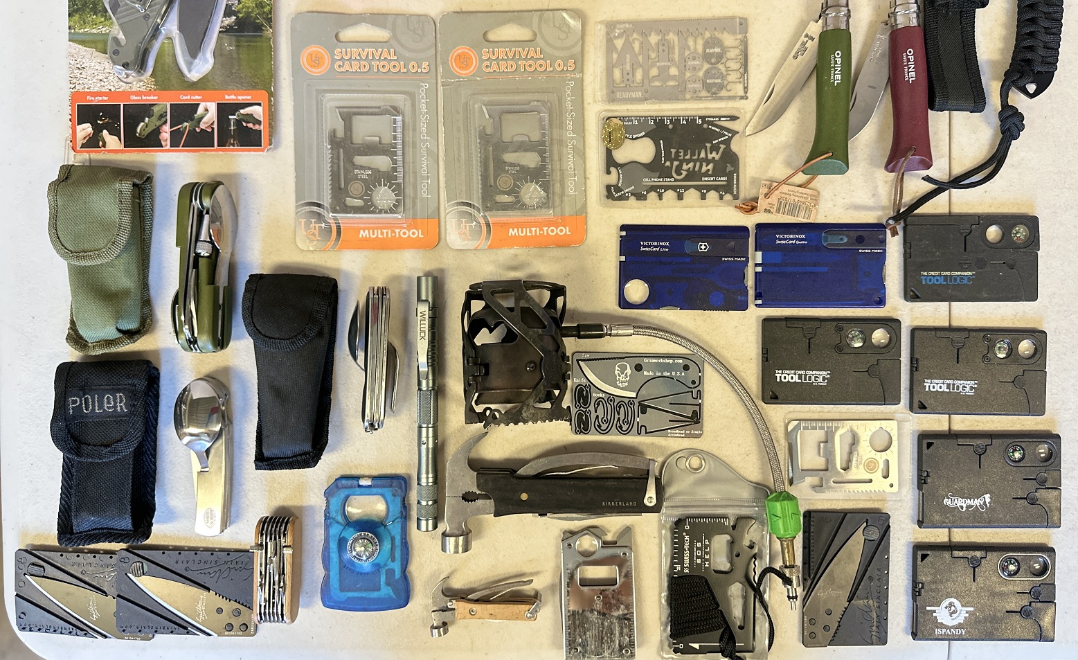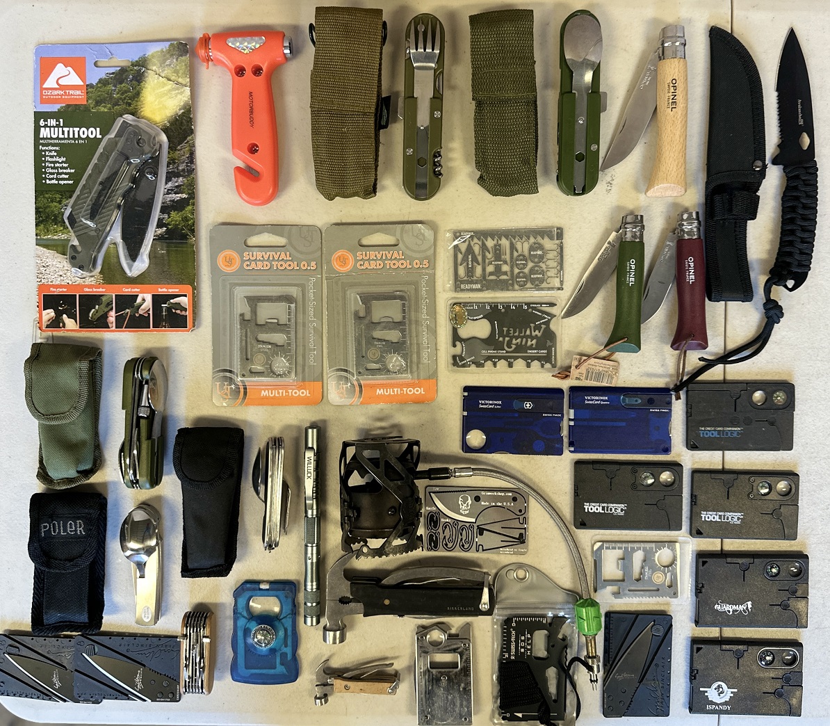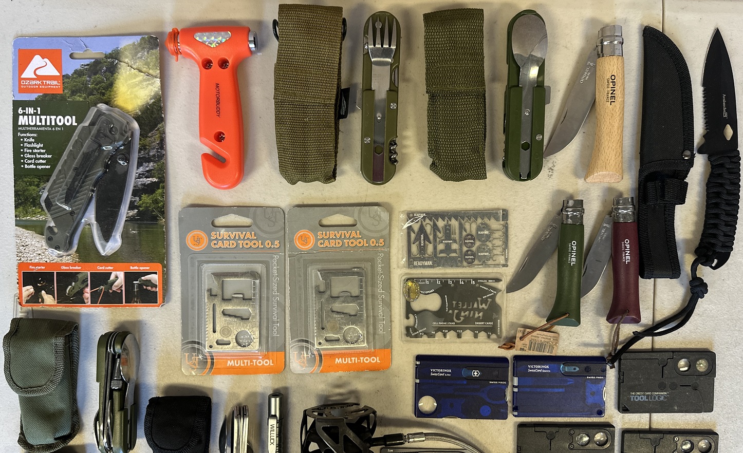 1 lot of assorted survival tools including Victorinox Swiss Card Lite, Survival Card Tools, Opinel knives, multi-tool axes, car safety hammer, Willuck tactical pen, Avalanche knife, Ozark Trail 6-in-1 multi-tool, etc.