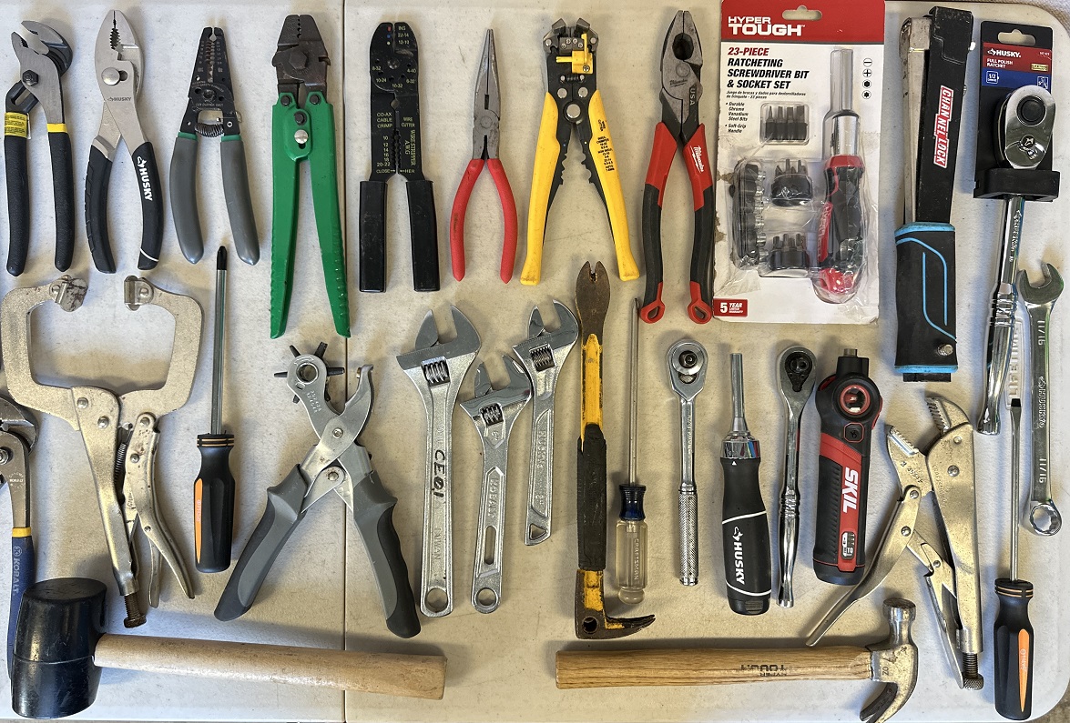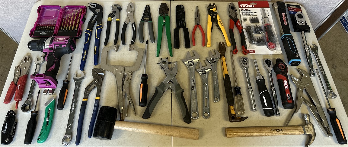 1 lot of assorted mechanic tools including drill bit set, assorted pliers, wire stripper, crimper, cordless drill (no battery), screwdrivers, utility knives, claw hammer, mallet, gasket punch, torque wrenches, combination wrenches, etc.