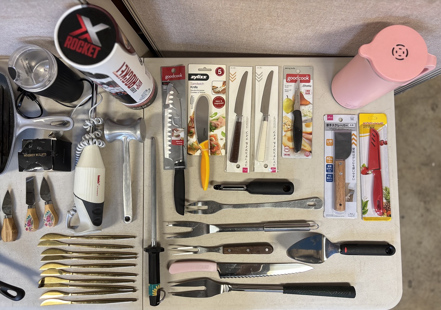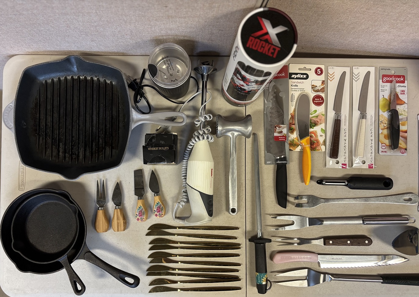 1 lot of kitchen goods including knives, Le Creuset pan, cast iron pans, blender, coffee grinder, hand blender, whiskey stones, soymilk maker, meat tenderizer, cheese knives, table knives, etc.