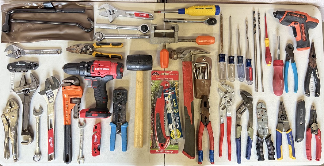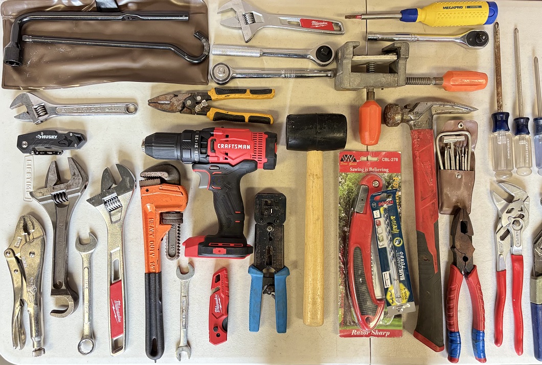 1 lot of assorted mechanic tools including Craftsman CMCD700 (no battery), Black & Decker screwdriver, assorted pliers and wrenches, utility knives, rubber mallet, claw hammer, screwdrivers, handsaw, torque wrenches, etc.