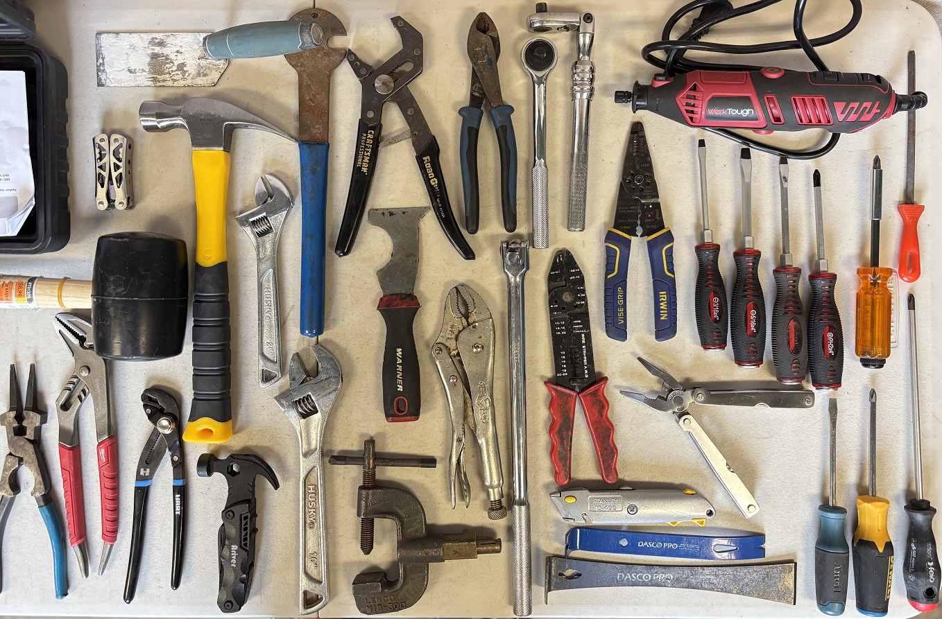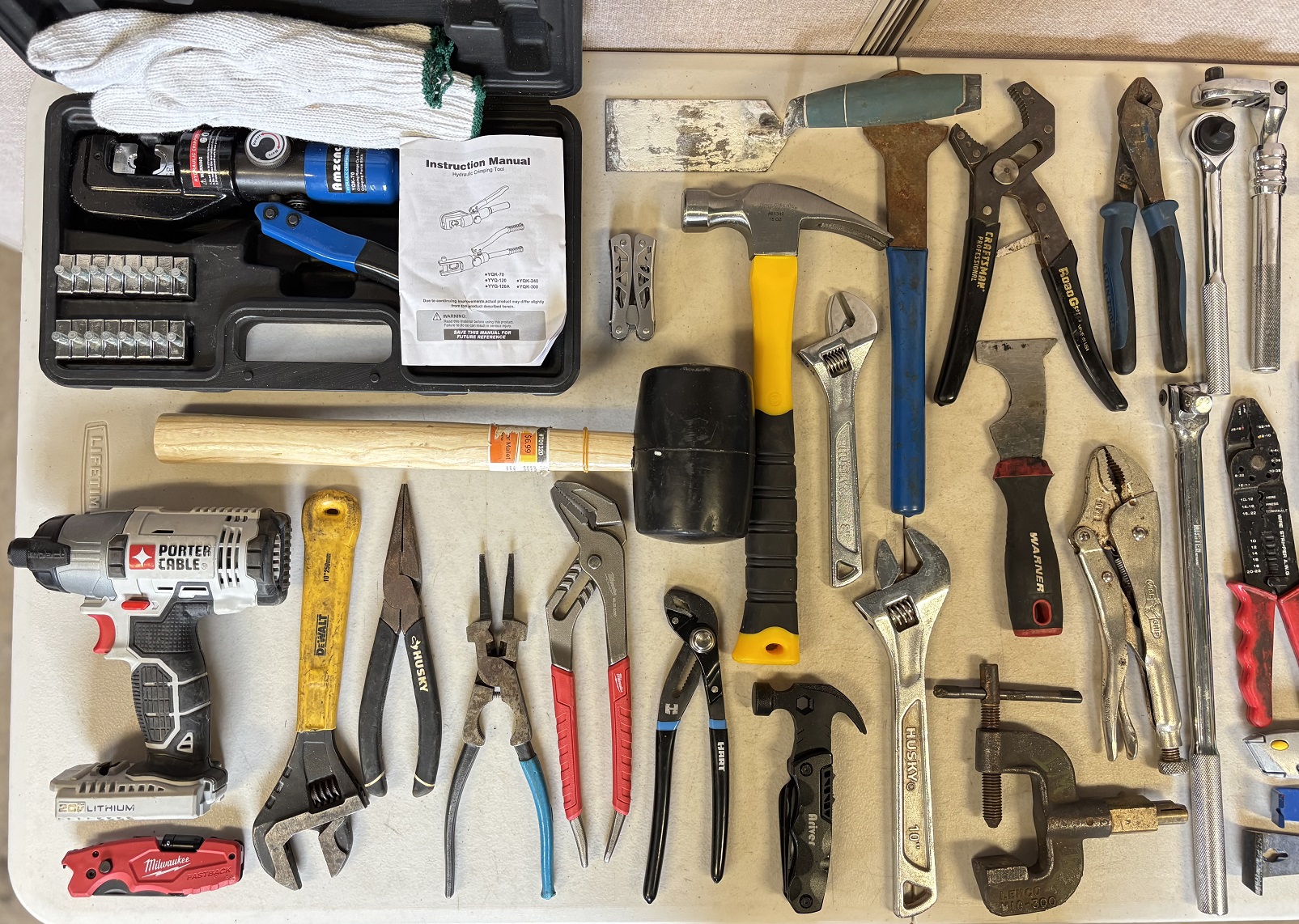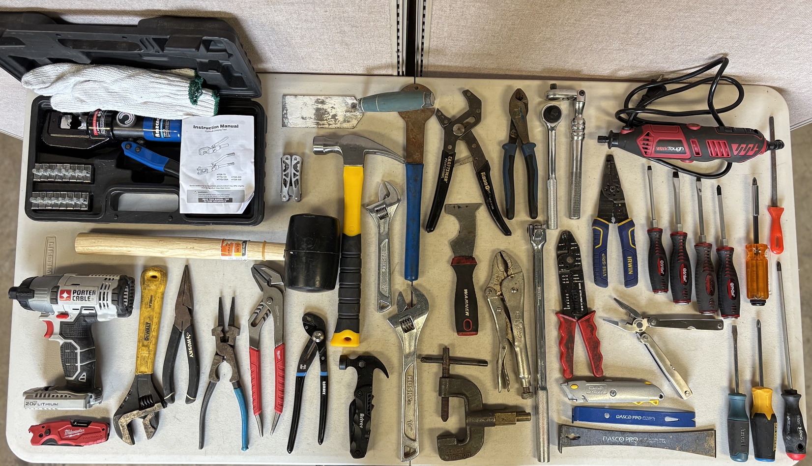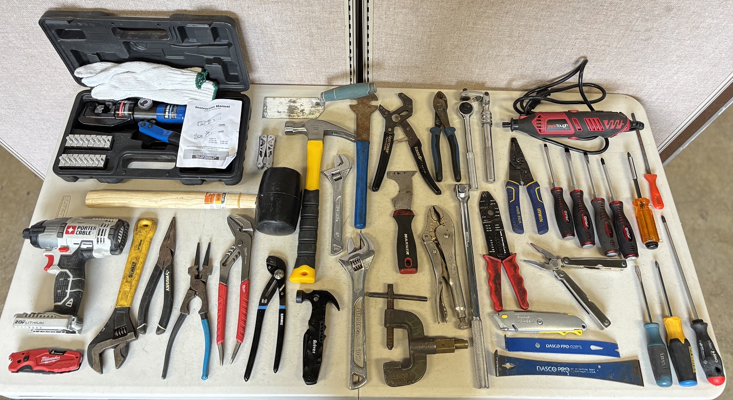 1 lot of assorted mechanic tools including hydraulic crimper, rubber mallet, claw hammer, utility knives, multi-tools, screwdrivers, pry bars, assorted pliers and wrenches, torque wrenches, wire strippers, Werk Tough rotary tool, tubing cutter, scrapers, file, Porter Cable drill (no battery), etc.