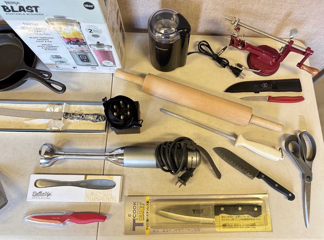 1 lot of assorted kitchen utensils including Ninja blender, whiskey stones, knives, scissors, chopper, coffee grinder, cast iron pans, rolling pin, grill spatula, hand blender, apple peeler, etc.